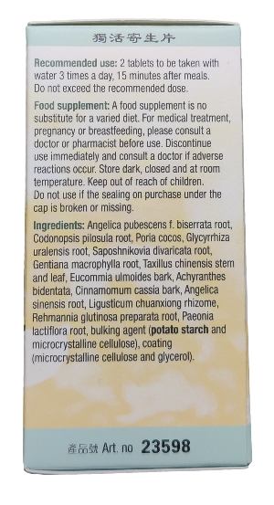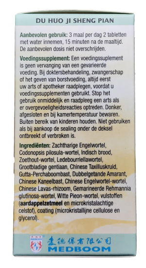 Du Huo Ji Sheng Pian is bedoelt voor gewrichts- en spierpijn in de benen, vooral de knieën en enkels, evt met oedeem. Als het erger wordt met (koud) vochtig weer. Een gevoel van zwaarte en gevoelloosheid. Gewrichten vertonen een verminderd bewegingsbereik met duidelijke stijfheid Vochtige kwade Qi is een belangrijk obstakel voor de doorstroming van Qi en Bloed. Vocht is kleverig, zwaar, plakkerig en moeilijk op te lossen, wat bijdraagt tot chroniciteit. Vocht heeft de neiging zich neerwaarts te nestelen, vaak in de benen, vooral de knieën en enkels, en kan gepaard gaan met zwelling en oedeem. Het is erger bij weersveranderingen, vooral als het weer zelf koud en vochtig is. Mensen met reeds bestaande Milttekorten of vochtige constituties zijn vatbaarder voor het Wind Damp, Koud Damp en Vochtige Hitte Bi Syndroom.