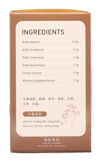 Xiao Chai Hu Tang bestaat uit zes kruiden. Het belangrijkste Chinese kruid, Chai Hu (Radix Bupleuri), is een belangrijk kruid tegen prikkelbaarheid als gevolg van lever Qi-stagnatie. Chai Hu verkoelt en kalmeert de lever met een opgaande actie die voorkomt dat het kwaad verder het binnenste binnendringt. Hier wordt Chai Hu gecombineerd met Huang Qin (Radix Scutellariae), dat helpt bij het afvoeren van warmte uit het lever- en galblaasstelsel en het uitdrijven van kwaad. Samen hebben deze twee kruiden een krachtig rustgevend effect.