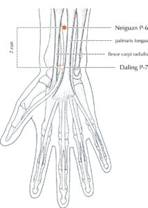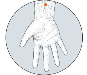 Dit punt vind je aan de binnenkant van je arm. Twee Cun van de pols, in het midden tussen de twee pezen. Een Cun is je eigen duimbreedte, als je op je linker arm je pink (van je rechterhand) op de polsplooi (die vind je door je pols naar binnen te buigen) legt, dan zit je wijsvinger op de goede plek.